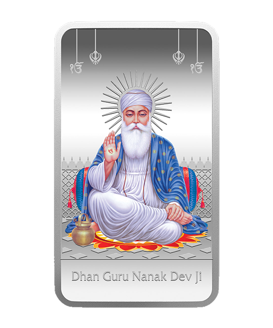 A one of its kind products, this 50gm silver bar portrays Guru Nanak Sahib Ji. The Guru is revered across the world by millions as the founder of Sikhism and the first of the ten Sikh Gurus. Guru Nanak set up a unique spiritual, social, and political platform based on equality, a fraternity of love, goodness, and virtue. An exceptional product, the coloured Guru Nanak Silver bar represents the spiritual radiance of the Saint. This classic beauty comes beautifully packed in a deluxe presentation box, making it ideal for gifting, while also appealing to collectors of limitededition world-class products